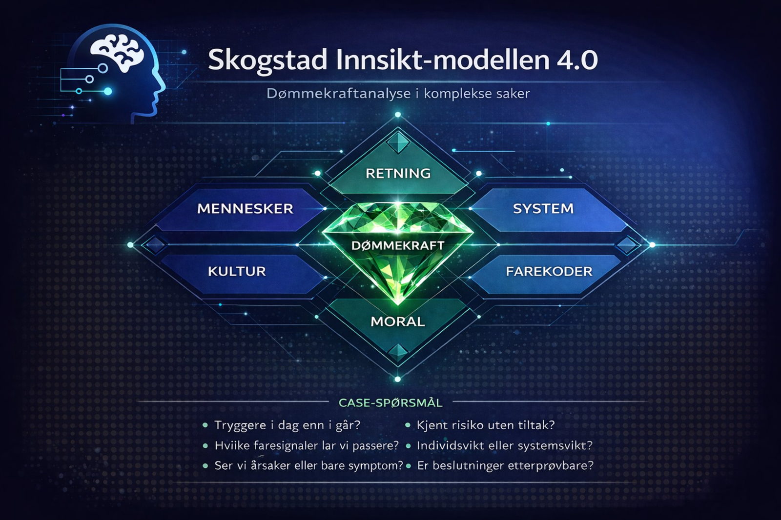 Når alle i rommet har delvis rett, men ingen ser helheten. Dømmekraft basert på strukturert innsikt, ikke magefølelse, ikke teori, ikke synsing. Innsikt og samarbeid og kollegial læring. Nye muligheter har åpnet seg gjennom bruk av kunstig intelligens, strukturert metode og digital produksjon av dømmekraftanalyser. Arbeidet skjer foreløpig manuelt og basert på "motoren SI-modellen", et faglig fundament og et system som gjør det mulig å skalere tjenestene over tid.